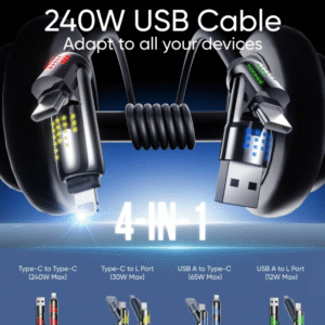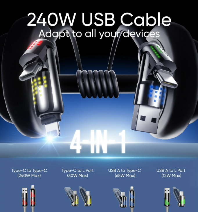 4-in-1 Ladekabel, 240 W Superschnellladung, integriertes RGB-Licht, universelle Kompatibilität, robustes Kabelmaterial, flexibel und langlebig