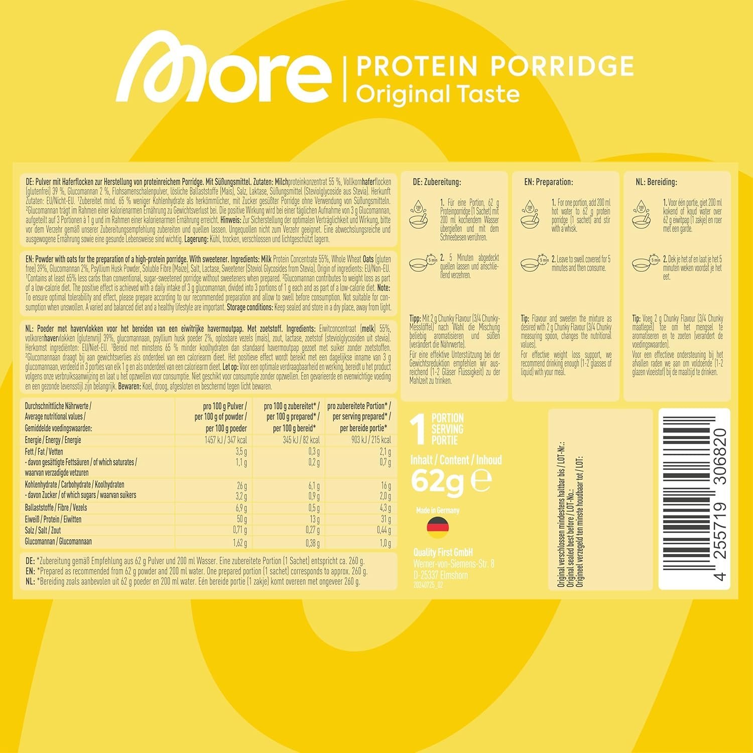 Ingredients:MILK Protein Concentrate 55%, Whole Wheat OATS (gluten free) 39%, Glucomannan (from Konjac Root) 2%, Psyllium Husk Powder, Soluble Fibre (Maize), Salt, Lactase, Sweetener (Steviol Glycosides from Stevia). Origin of ingredients: EU/Non-EU.